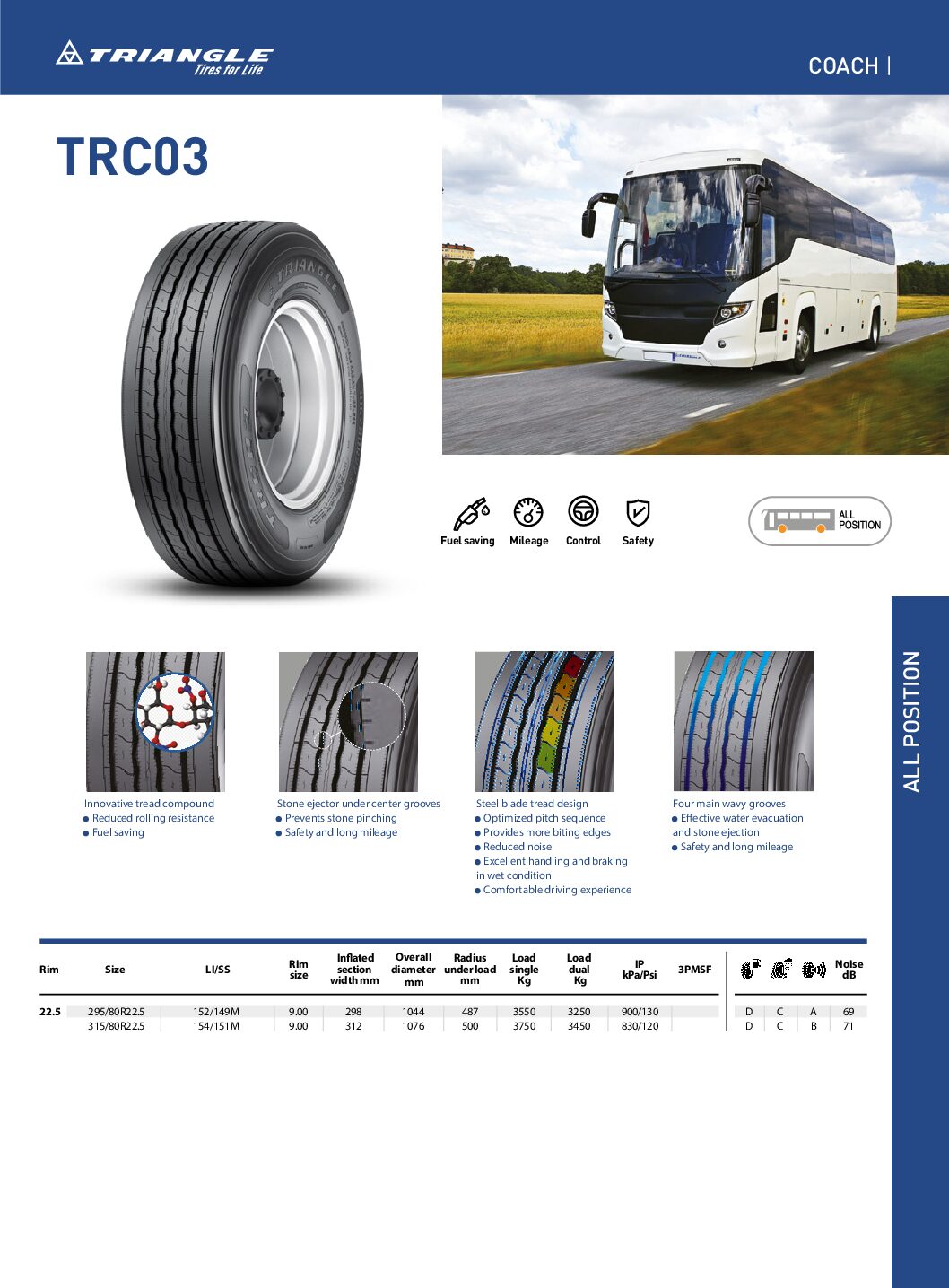 Anvelopa autobuz Triangle TRC03 295/80R22.5 este special concepută pentru vehicule de transport persoane, oferind siguranță, confort și durabilitate în exploatare intensivă. Este ideală pentru utilizare pe axe de direcție și toate pozițiile, în transport urban și interurban.