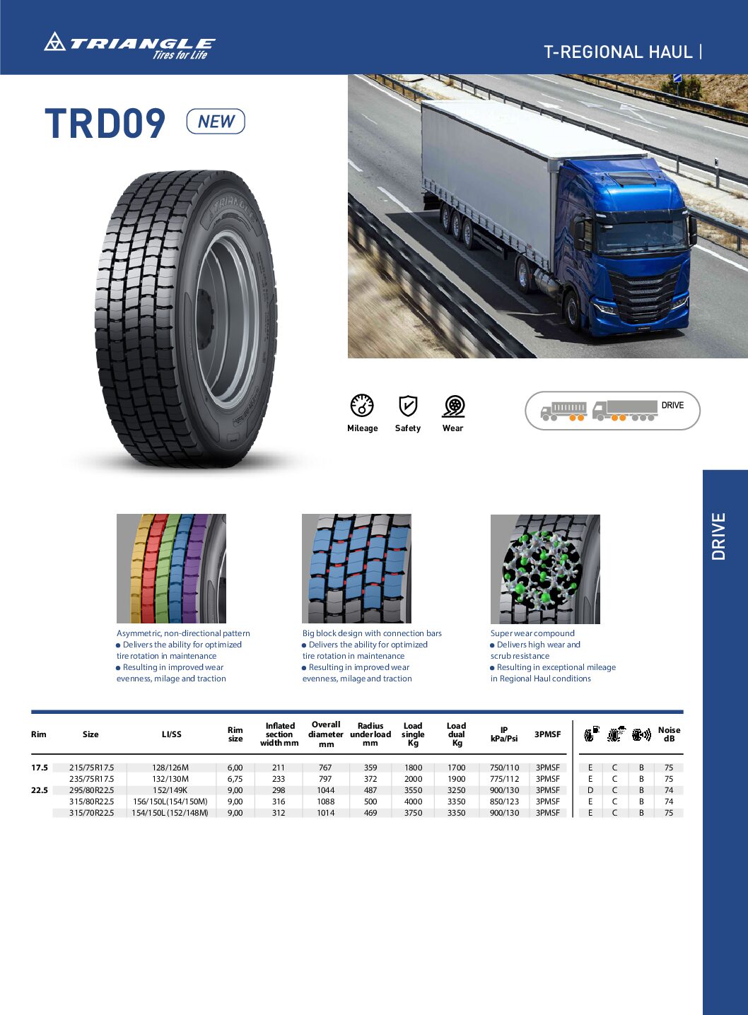 Anvelopa TIR Triangle TRD09 315/70R22.5 este proiectată pentru axa de tracțiune a vehiculelor comerciale grele, oferind performanță excelentă în condiții dificile de drum și exploatare intensivă. Este ideală pentru transport regional și pe distanțe lungi, unde tracțiunea și durabilitatea sunt esențiale.